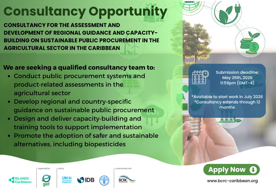 The Basel Convention Regional Centre for Training and Technology Transfer for the Caribbean (BCRC-Caribbean) aims to collaborate with Caribbean countries in implementing their international obligations to the Basel, Rotterdam, Stockholm and Minamata Conventions and other multilateral environmental treaties to sustainably manage wastes and chemicals for the protection of human health and the environment.